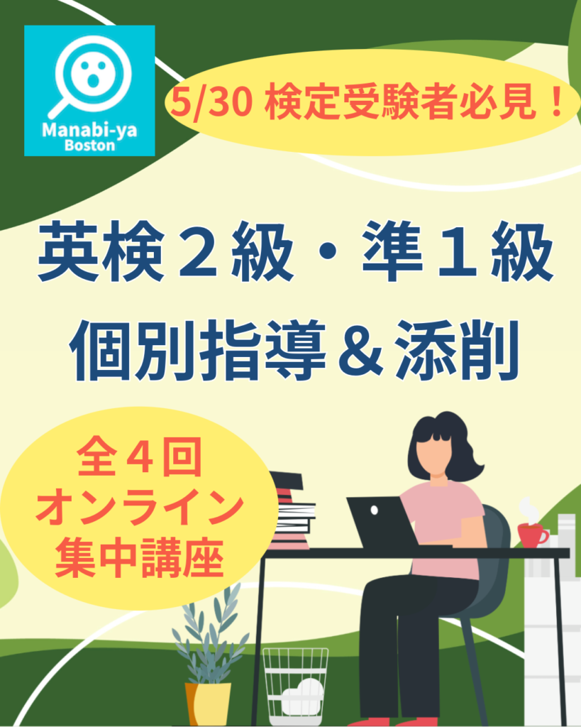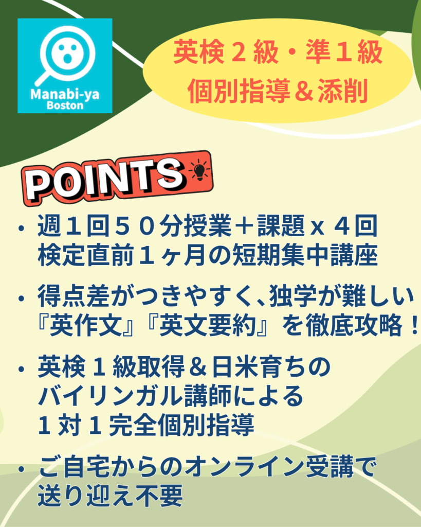 Manabi-ya Bostonでは、最も得点差がつきやすく、独学が難しいライティング「英文要約」と「英作文」を徹底攻略する個別指導講座を開講します。英検1級取得済みで日米双方で育ったバイリンガル講師が、マンツーマンで苦手分野克服をサポートします。